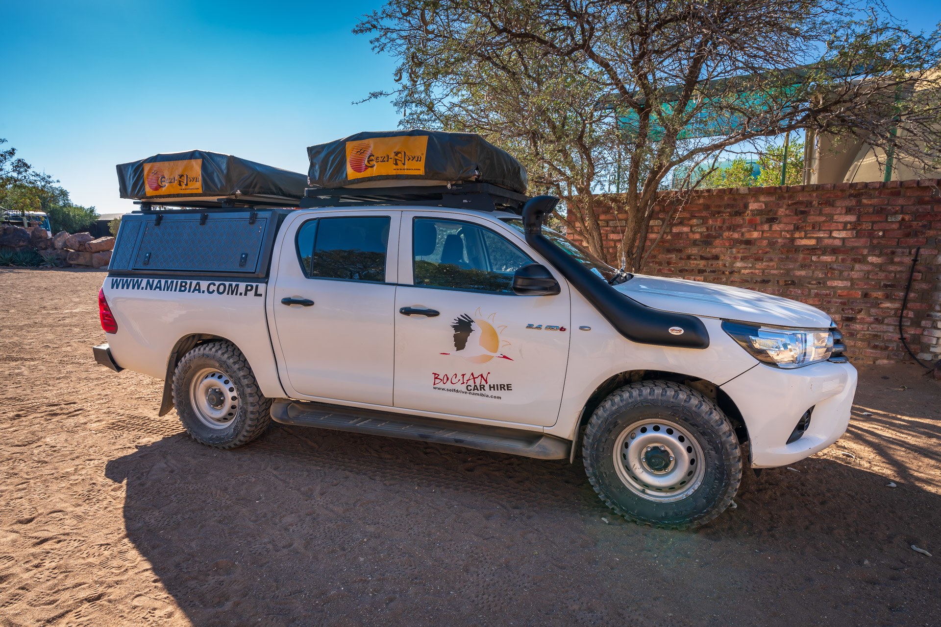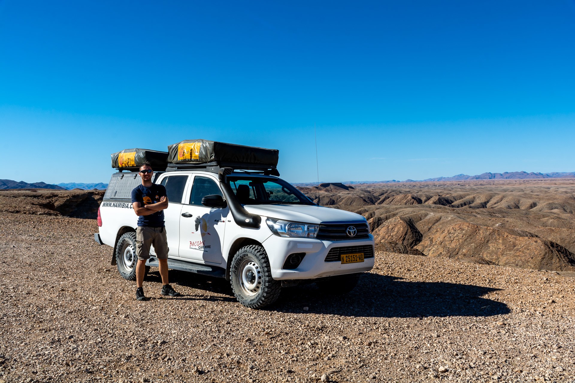 Jeżeli jednak planujemy samodzielną wycieczkę objazdową po całym kraju lub po dużej jego części, najwygodniejszą opcją jest wynajęcie samochodu terenowego. Lepiej się sprawdzi na drogach szutrowych, których jest w tym kraju najwięcej. Dodatkowo umożliwi również pokonanie trudniejszych piaszczystych lub kamienistych odcinków. Nasz dodatkowo posiadał namiot na dachu, więc dużą część noclegów rezerwowaliśmy na campingach.