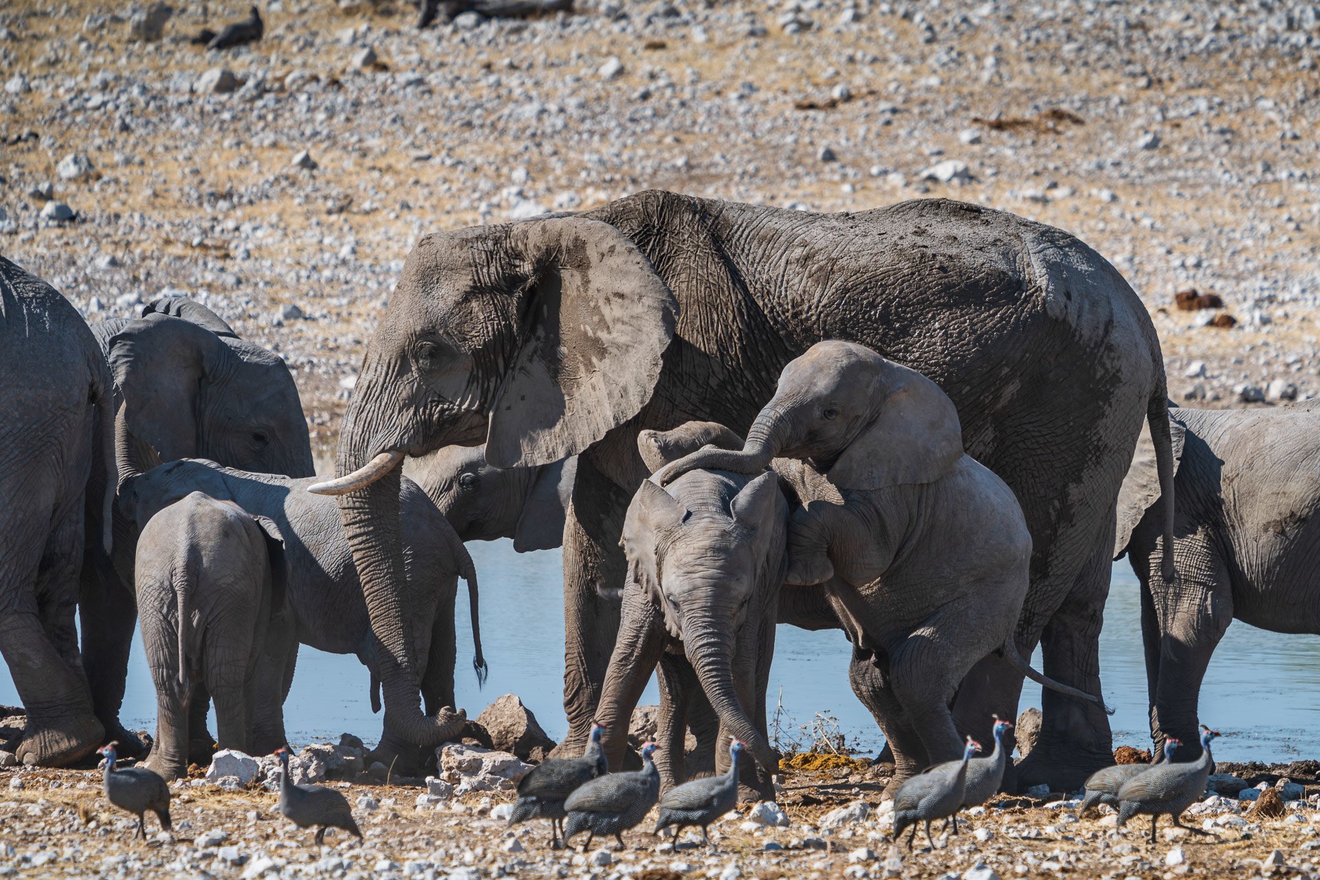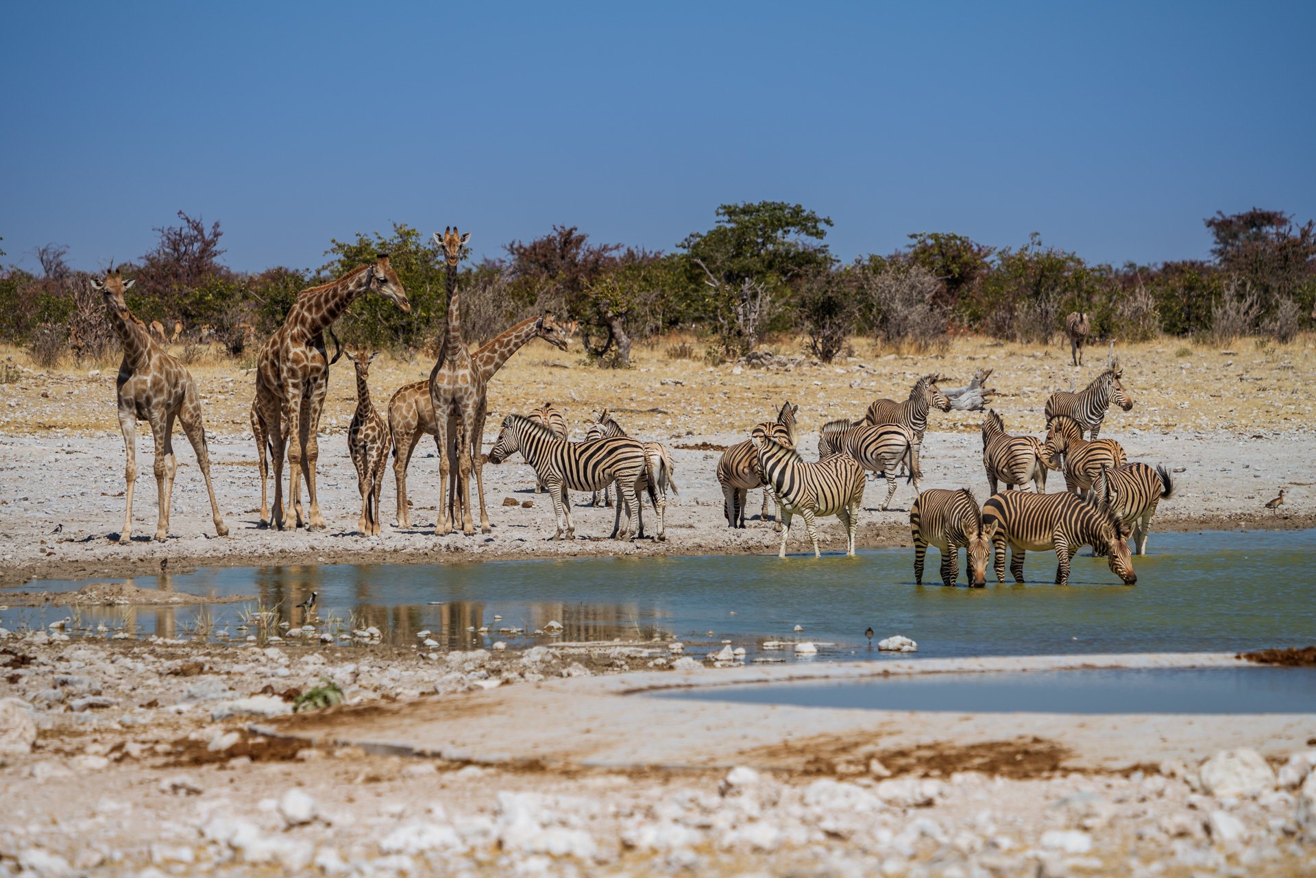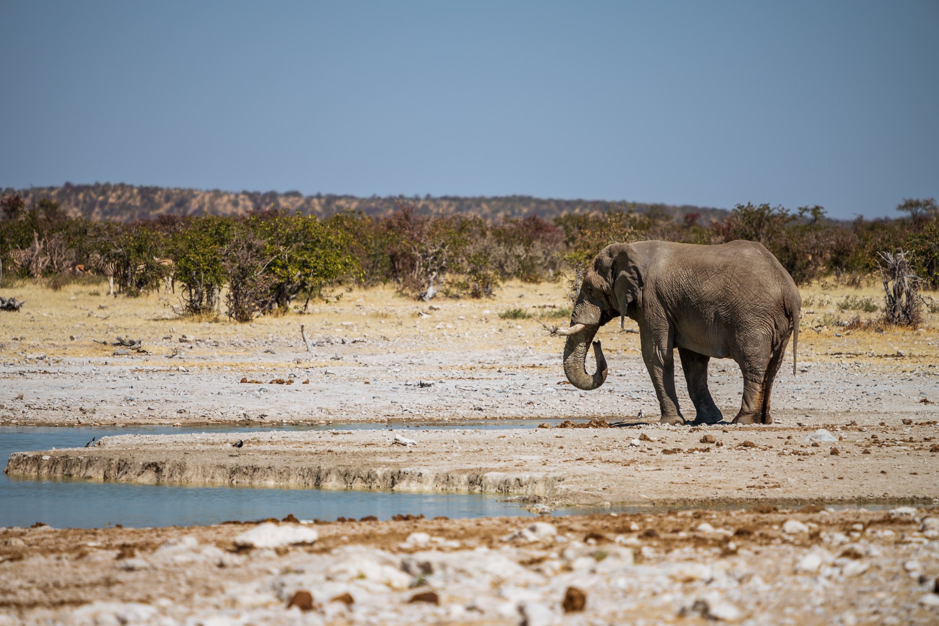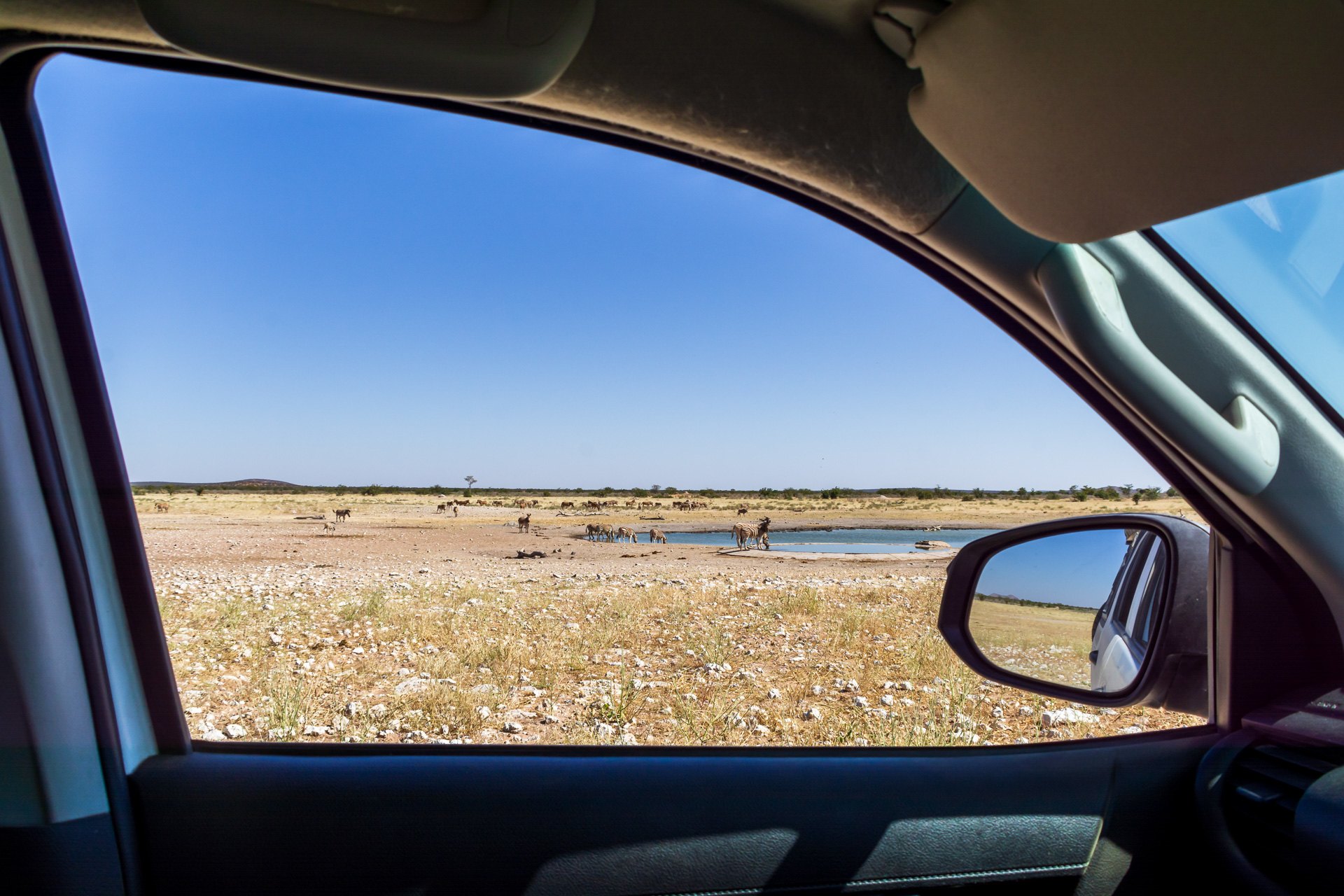 Szczęśliwi podjeżdżamy do pierwszego oczka wodnego. Okazuje się, że zamiast powolnej jazdy koło krzaków, lepszym sposobem jest podjechanie do jeziorka, zaparkowanie i czekanie. Tutaj udaje się nam zaobserwować dziesiątki zwierząt, które w systemie zmianowym podchodzą do wodopoju. Zebry, żyrafy, antylopy, słonie, ptaki, szakale.