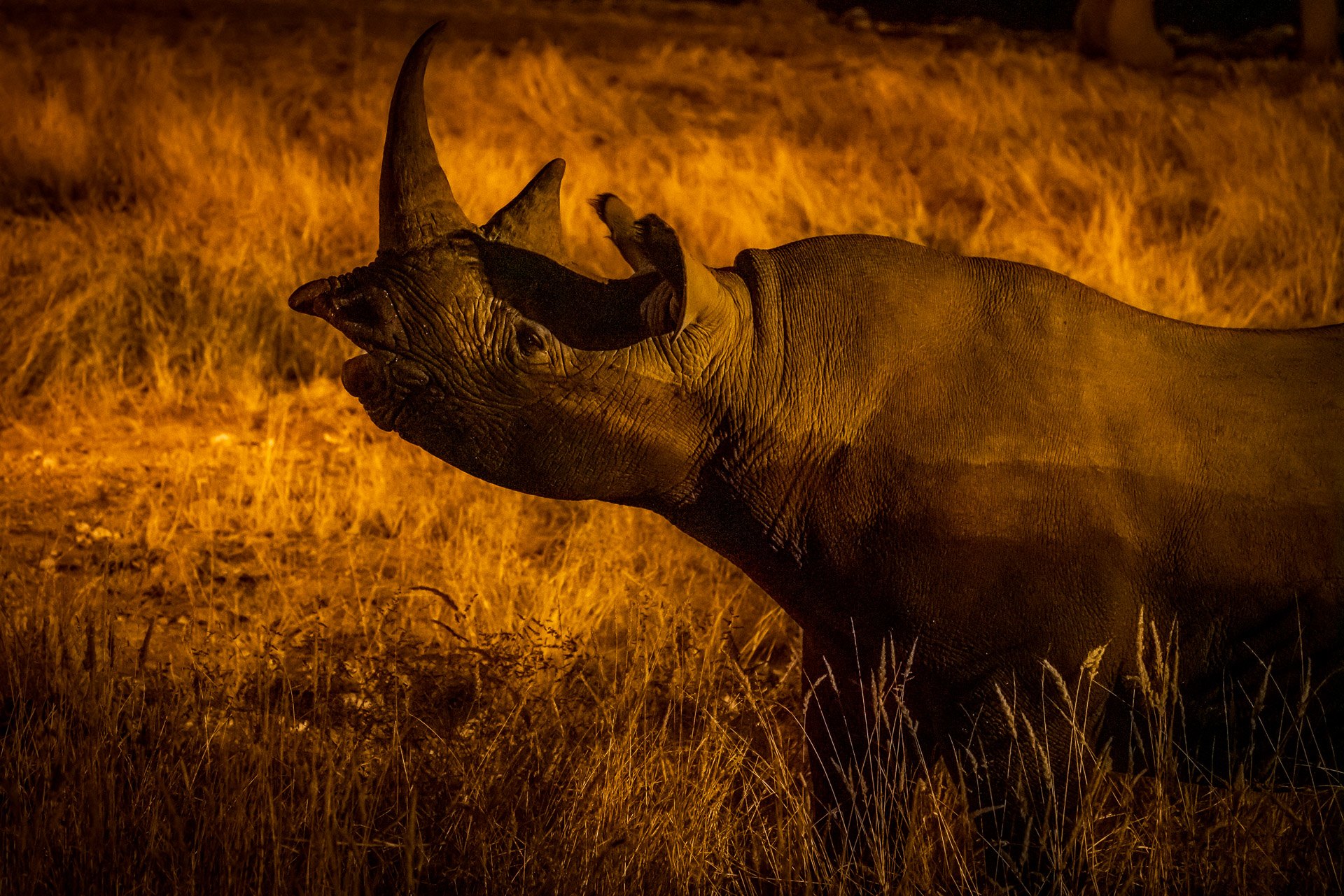 Tym razem jeziorko jest odgrodzone barierkami i można sobie siedzieć pod gołym niebem. Ludzi na campingu jest więcej niż w poprzednim obozie i trzeba się trochę nakombinować, żeby znaleźć sobie dobrą miejscówkę. O zachodzie słońca nad wodopojem pojawia się stado słoni. Obserwujemy je, po czym idziemy na kolację. Planujemy spróbować szczęścia jeszcze raz, po zmroku. Przychodzimy, a tu znowu słonie! Ciekawie się je ogląda, ale jest też taki problem, że stado potrafi zajmować przestrzeń jeziorka bardzo długo, a wtedy żadne inne zwierzęta się nie zbliżają. Ale kiedy już słonie schodzą ze sceny, pojawia się hiena. I 2 nosorożce! Obserwujemy je dość długo, po czym, usatysfakcjonowani idziemy spać ?